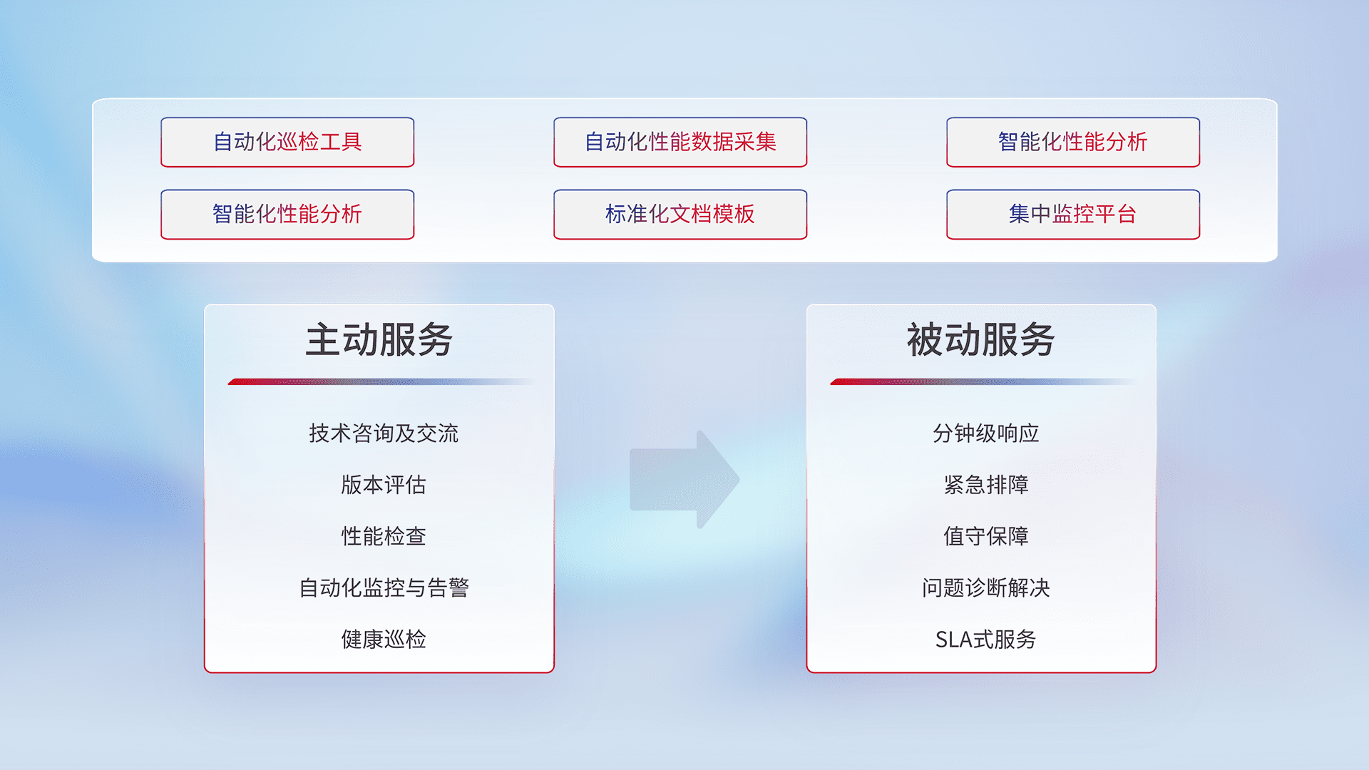 智能化工具和标准化文档,,保障服务质量,,,提供主动服务(包含技术咨询、、、版本评估、、、性能检查、、自动化监控与告警、、、健康巡检)和被动服务包含(分钟级响应、、、紧急排障、、、、值守保障、、、问题诊断解决、、、、SLA服务)。。